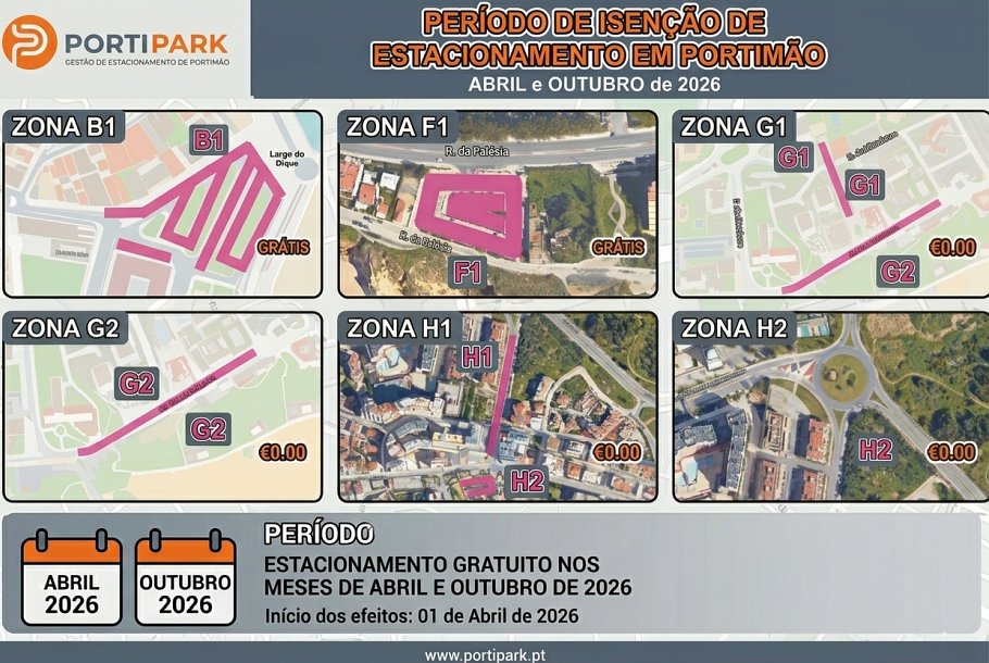 Por determinação do Sr. Presidente da Câmara Municipal de Portimão, o estacionamento de duração limitada (ZEDL) correspondente às zonas B1, F1, G1, G2, H1 e H2, respetivamente no Largo do Dique e na Praia da Rocha, durante os meses de abril e outubro será gratuito.
